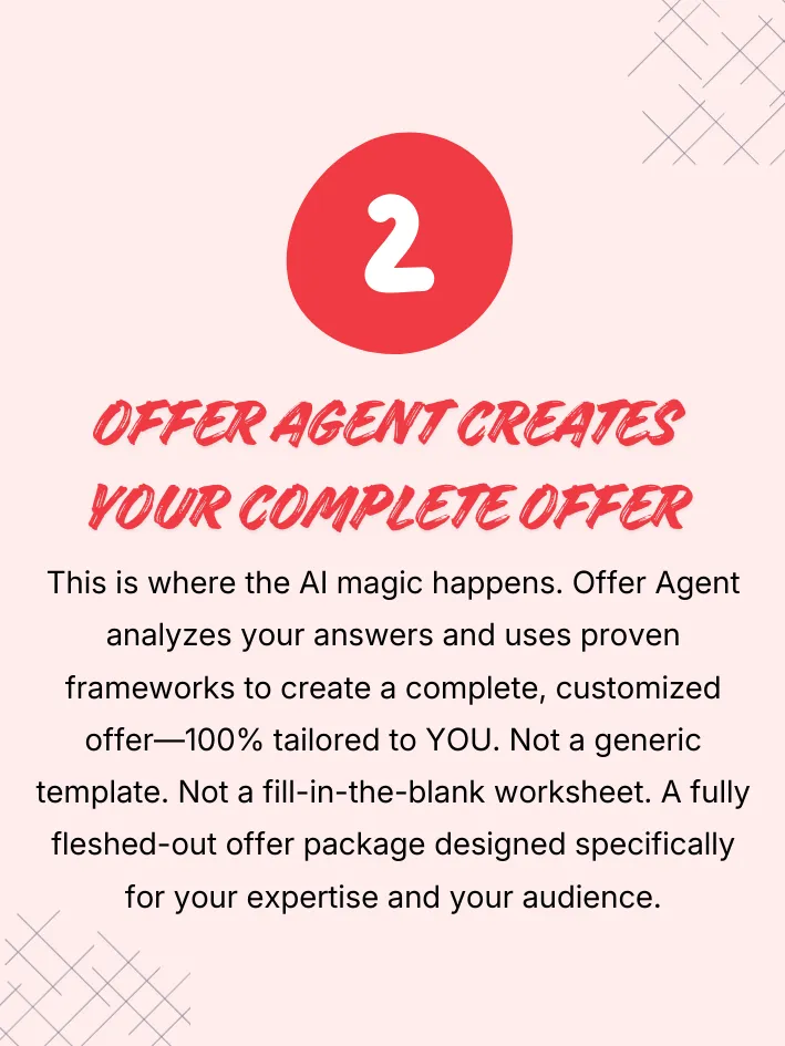 If you have knowledge that others would pay for—whether you're a consultant, coach, therapist, trainer, specialist, or expert in ANY field—Offer Agent can create an offer for you. The AI adapts to YOUR unique expertise and audience.